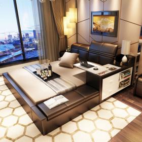 创意真皮床双人床现代婚床1.8米1.5榻榻米床储物床皮艺床软床大床 床侧储物 升降靠背 双ll价格 更低